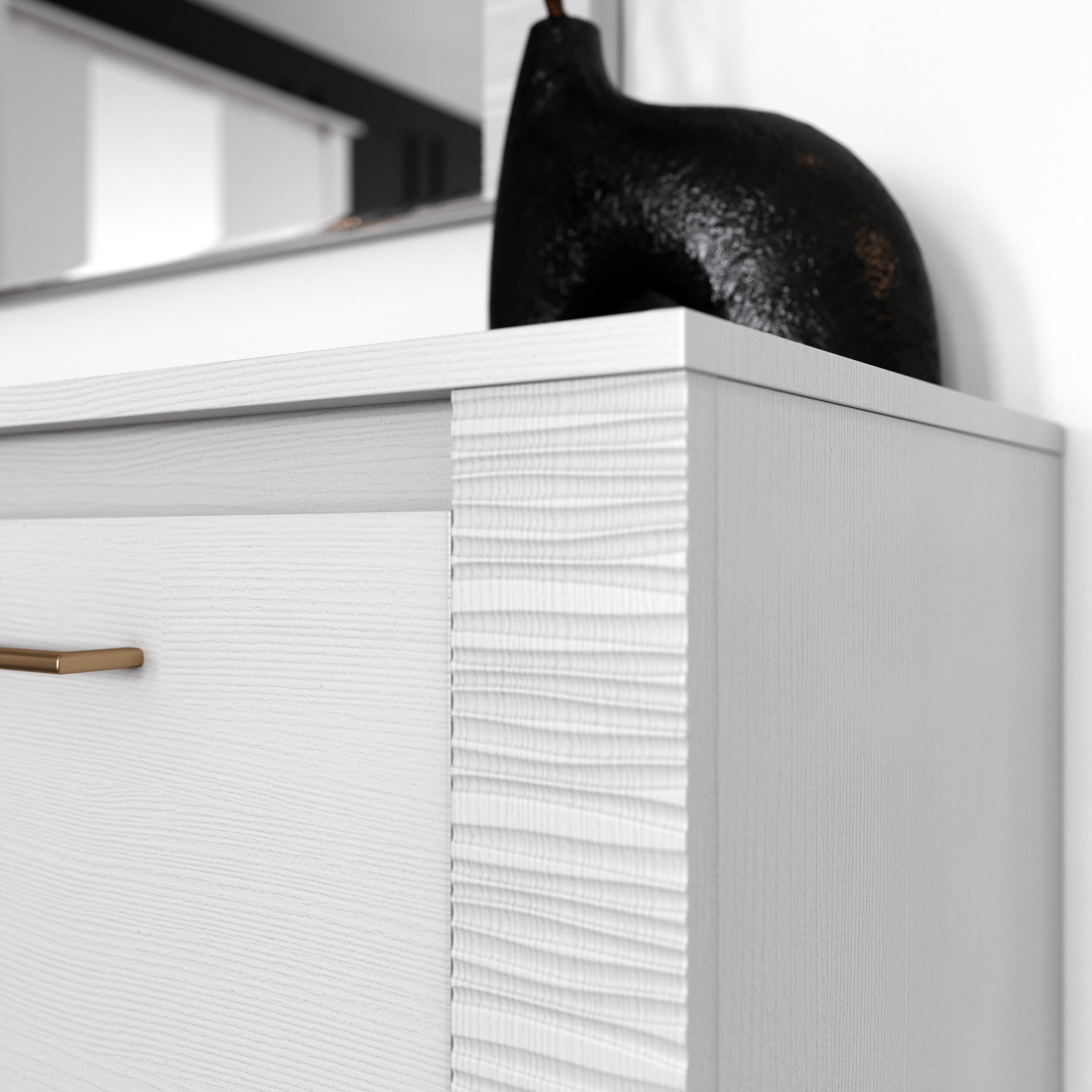 Комод оснащен четырьмя выдвижными ящиками на роликовых направляющих. Под столешницей имеется стеклянная панель (5 мм), предназначенная для установки светильника. Комплект подсветки (светильник и блок питания) приобретается отдельно. Блок питания рассчитан на подключение шести светильников.